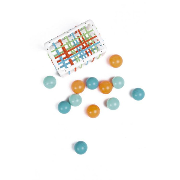 Desc. Técnica: Um jogo de encaixe original! Descubra um cubo decorado com elásticos entrelaçados e 12 bolinhas de cores vivas com sons engraçados. As crianças divertem-se inserindo as bolas no cubo através dos elásticos coloridos e depois removendo-as. Este jogo original é baseado na aprendizagem experimental. Que satisfação conseguir guardar tudo no cubo! Um desafio motor para os mais pequenos. Este jogo arejado e colorido desperta o interesse das crianças. Os lados abertos do cubo, ligados por elásticos esticados, são muito fáceis de segurar. As crianças trabalham a sua agilidade e força para encaixar as 12 bolas nos elásticos. Depois, usam a estratégia para tentar tirá-los. Ao manipular o cubo, as crianças descobrem que é mais fácil colocar as bolas por uns lados do que por outros. Agarrar, empurrar, puxar, esgueirar-se... Este jogo estimula a preensão das crianças, mas também a sua lógica enquanto tonifica as suas capacidades motoras. O sucesso da ação e o reforço positivo dos pais permite que as crianças desenvolvam a autoconfiança e o vocabulário. À medida que as crianças crescem, aprendem a reconhecer as cores e a contar. Acompanhados pelos pais, os mais pequenos vão divertir-se a descobrir o número de bolas introduzidas no cubo e as que faltam introduzir. Imagine desafios ou jogos! As crianças adoram encontrar novas atividades para brincar com seus brinquedos favoritos! Um brinquedo bem pensado: As 12 bolas de cores vivas atraem a atenção das crianças. Estas bolas de brincar são dimensionadas para caber nas mãozinhas do bebé que podem manuseá-las facilmente. As 4 bolas laranja são leves e flexíveis, mas resistentes: o seu filho pode apertá-las à vontade, elas voltarão à sua forma inicial. As 8 bolas azuis, feitas de plástico rígido, emitem um pequeno ruído de maracas que desperta a acuidade sonora das crianças. Adequado para crianças com mais de 10 meses. Dimensões do cubo: 18 x 12 x 12 cm Dimensões da bola: ø 4,5 cm Composição das bolas laranja: ABS (Acrilonitrila Butadieno Estireno) e PE (polietileno) Composição das bolas azuis: Composição do cubo: Bolas laváveis com pano húmido