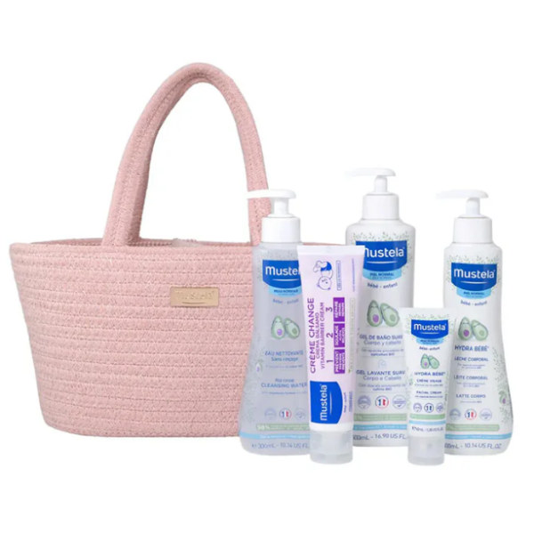 Mustela Bebé Kit é uma cesta composta pelo gel lavante suave, o hydra bébé creme rosto, o leite corporal, o creme zona fralda 123, o soro fisiológico, e os toalhetes de limpeza calmantes perfumados.